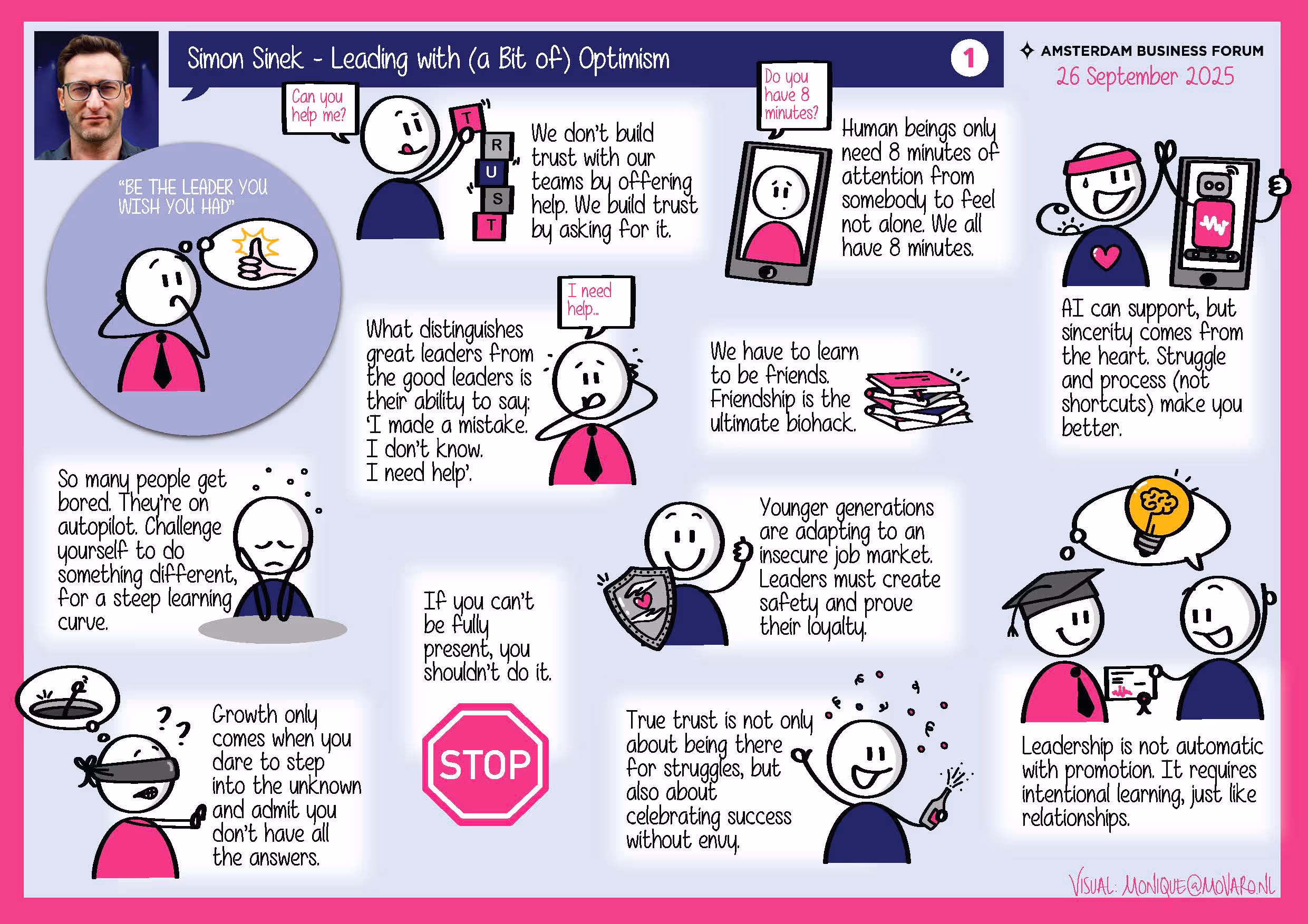 At Amsterdam Business Forum, leadership thinker and bestselling author Simon Sinek gave a masterclass in presence. In conversation with moderator Ikenna Azuike, he explored trust, burnout, friendship and the next generation at work, and showed how you can turn those themes into everyday leadership habits.